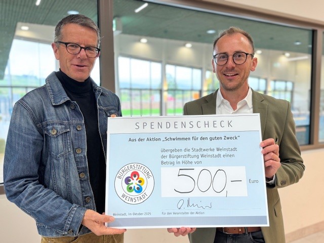 Beim Aktionstag im neuen Hallenbad "Das W" nutzten 131 Schwimmbegeisterte die Gelegenheit, für den guten Zweck ins Wasser zu springen und dabei gleich noch das neue Hallenbad auszutesten. Dabei kamen 131 Euro an Eintrittsgeldern zusammen, ergänzt durch 217 Euro an zusätzlichen Spenden zugunsten der Bürgerstiftung Weinstadt. Die Stadtwerke Weinstadt rundeten den Betrag schließlich auf insgesamt 500 Euro auf. Betriebsleiter Thomas Meier übergab nun symbolisch den Betrag an den Vorstandsvorsitzenden der Bürgerstiftung Weinstadt, Richard Heckert.